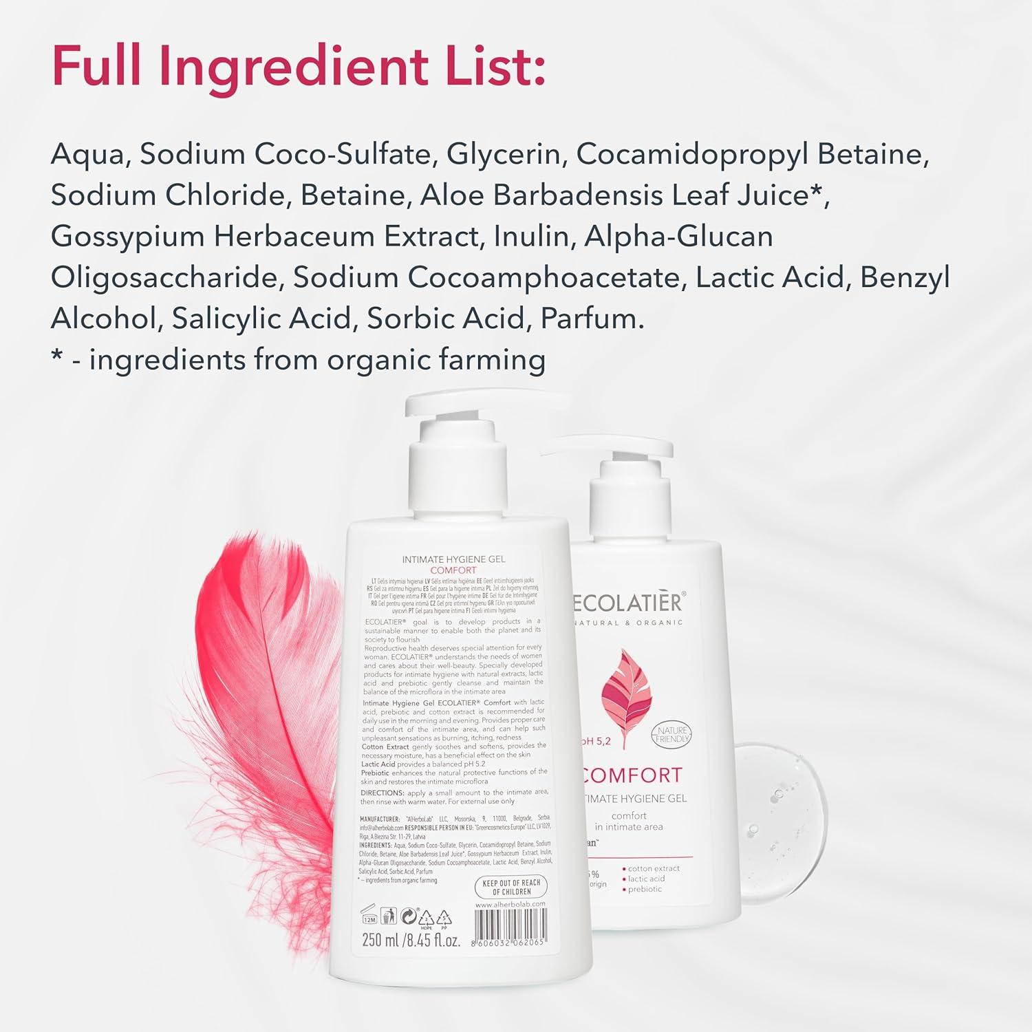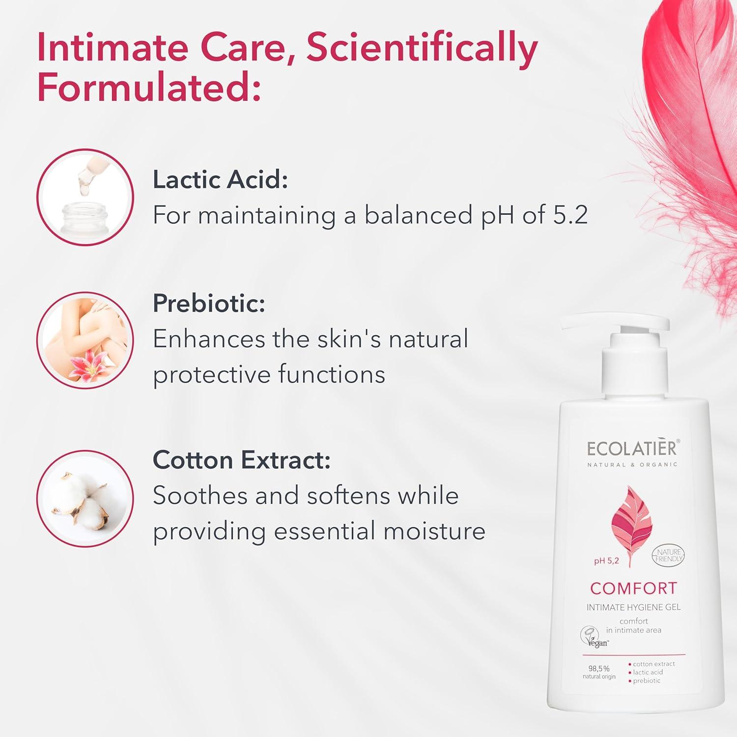 Intimate hygiene gel ECOLATIER® Comfort with lactic acid, prebiotic and сotton extract is recommended for daily use in the morning and evening. Provides proper care and comfort of the intimate area, and can halp such unpleasant sensations as burning, itching, redness