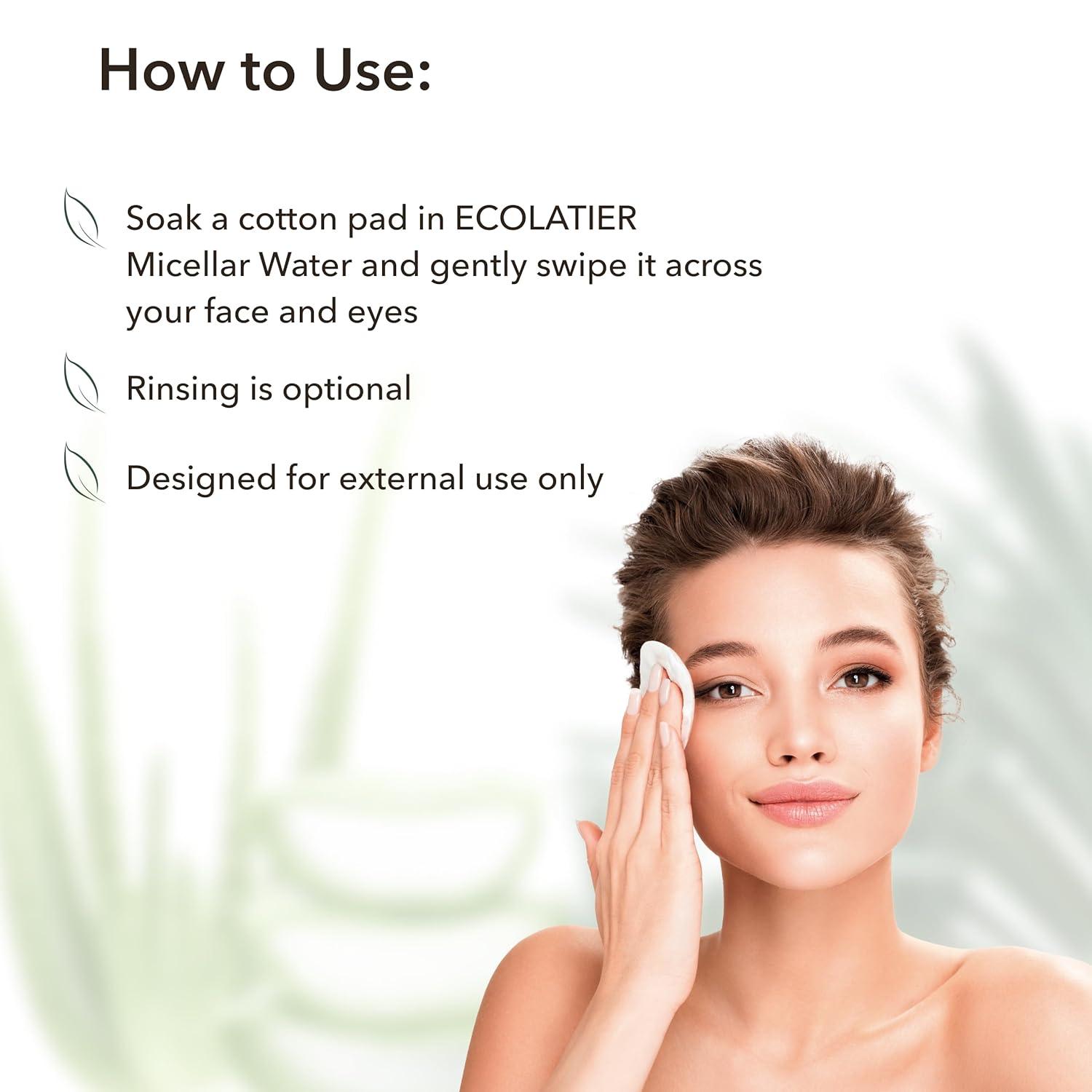 Micellar Water Cleansing & Moisrurizing ECOLATIER® ORGANIC ALOE VERA is powered by natural and organic ingredients, features for cleansing and makeup removal, moisturize and nourish the skin, preparing the face for further care
