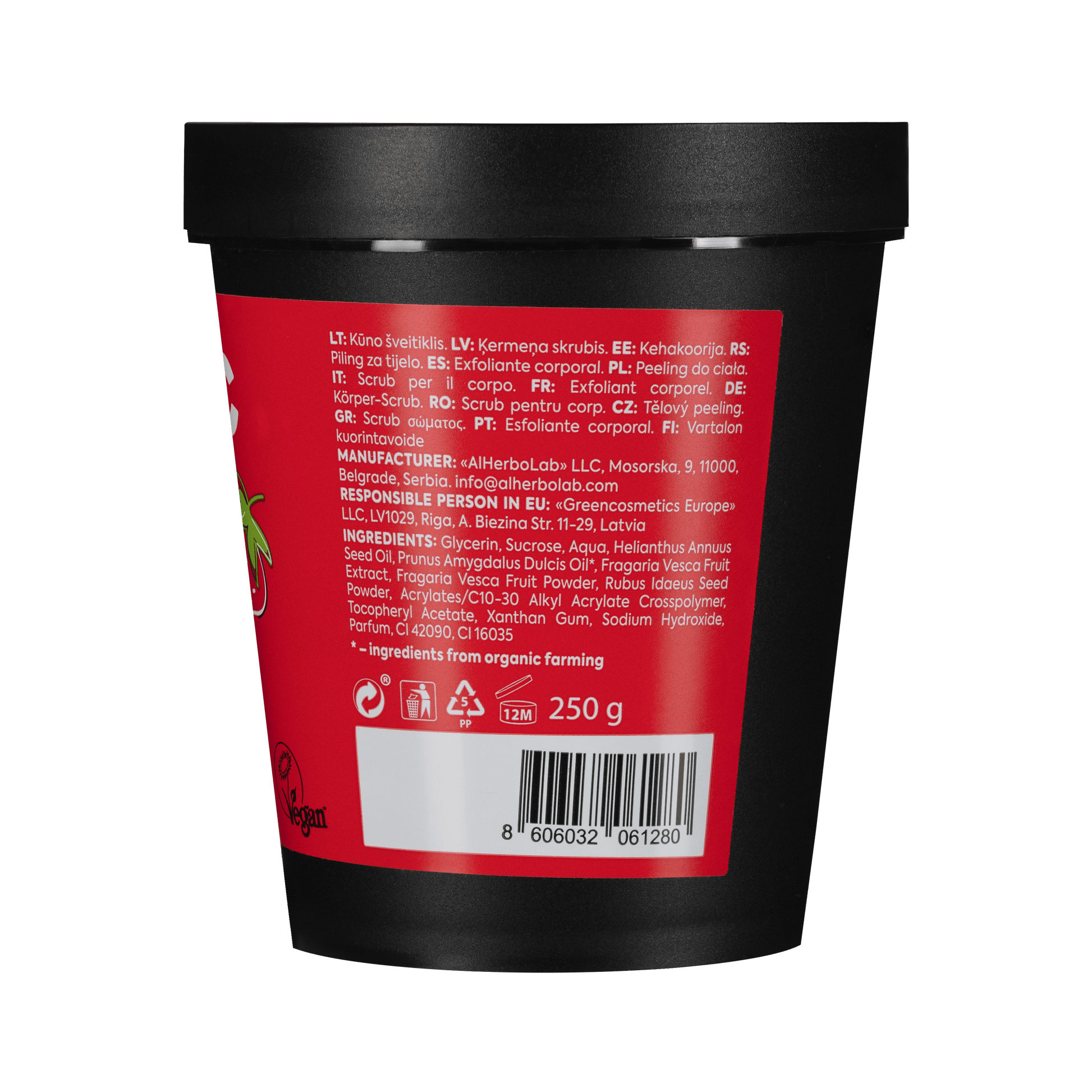 Sugar scrub based on strawberries and organic almond oil is the best choice for gentle cleansing of the most delicate and sensitive skin